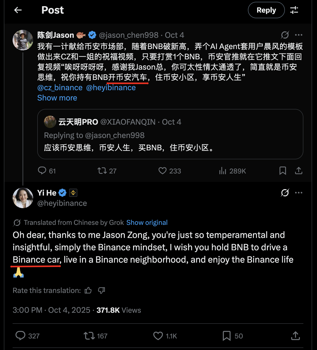 "I wish you hold BNB to drive a Binance car, live in a Binance neighborhood, and enjoy the Binance life."